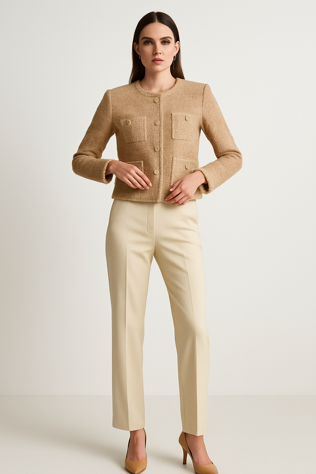 Diese Elegante kurze Damenjacke kombiniert einen raffinierten Schnitt mit modernem Stil. Die strukturierte Oberfläche und die aufgesetzten Fronttaschen mit Knöpfen verleihen dem Outfit einen stilvollen Pfiff. Die strukturierte Optik des Stoffes sorgt für Tiefe, während die Knöpfe stilvolle Akzente setzen. Der vielseitige kurze Schnitt lässt sich gut mit hoch taillierten Hosen, Röcken oder Kleidern kombinieren. Ideal für das Büro, zum Brunch oder für Abendveranstaltungen.
