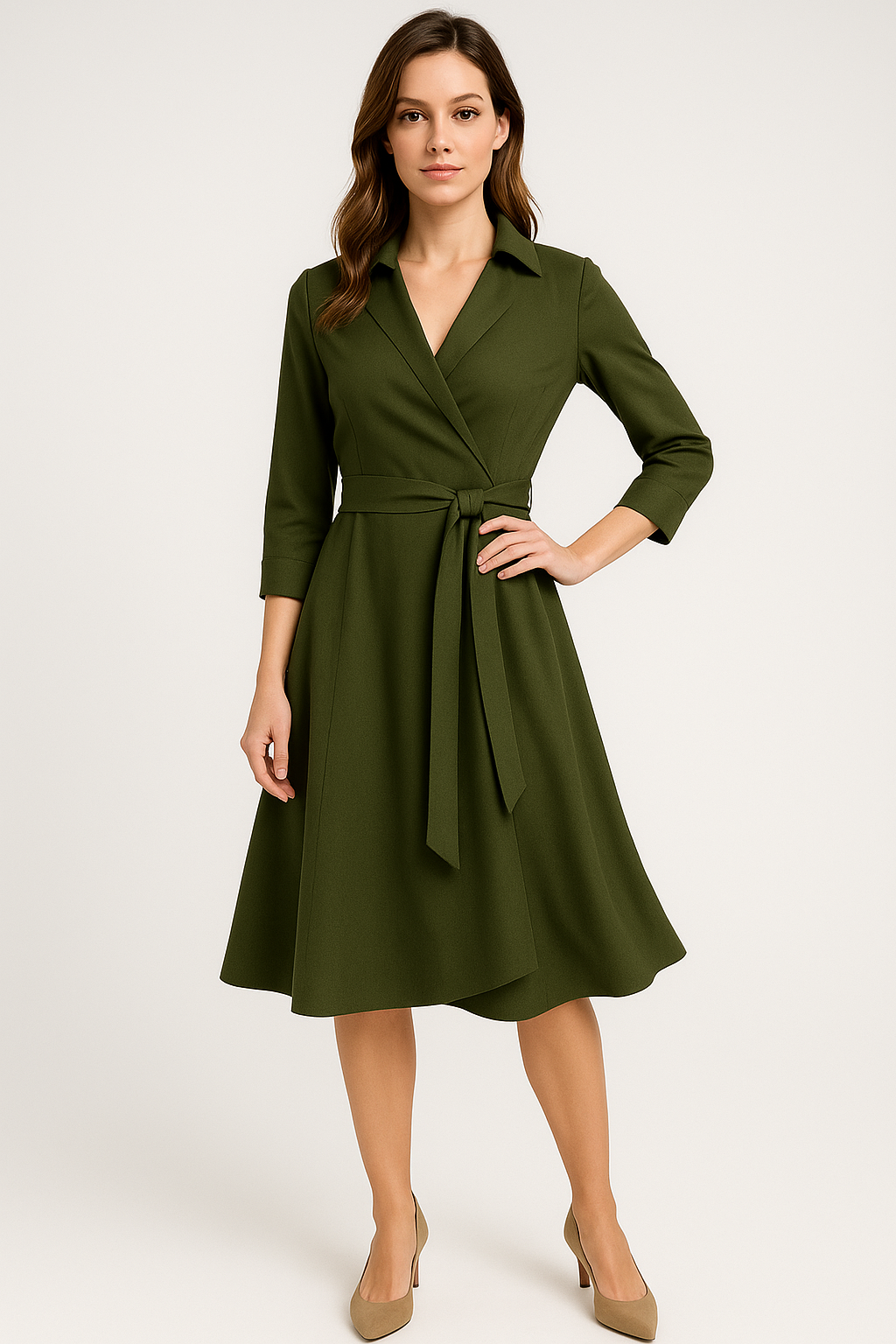 Dieses Midi-Kleid verkörpert schlichte Eleganz durch die schmeichelnde Wickelsilhouette und fein gearbeitete Einzelheiten. Der Hemdkragen, das Taillenband und der weich fallende Rock verleihen dem Aussehen eine stilvolle Ausstrahlung – ideal für formelle Anlässe. Das Wickel-Entwurf sorgt für eine anpassbare, figurbetonte Passform, während das Taillenband die Silhouette elegant betont. Der Hemdkragen verleiht dem Aussehen klassische Raffinesse. Die vielseitige Midi-Länge ist perfekt für Events, Geschäftsessen oder stilvolle Abendtermine.